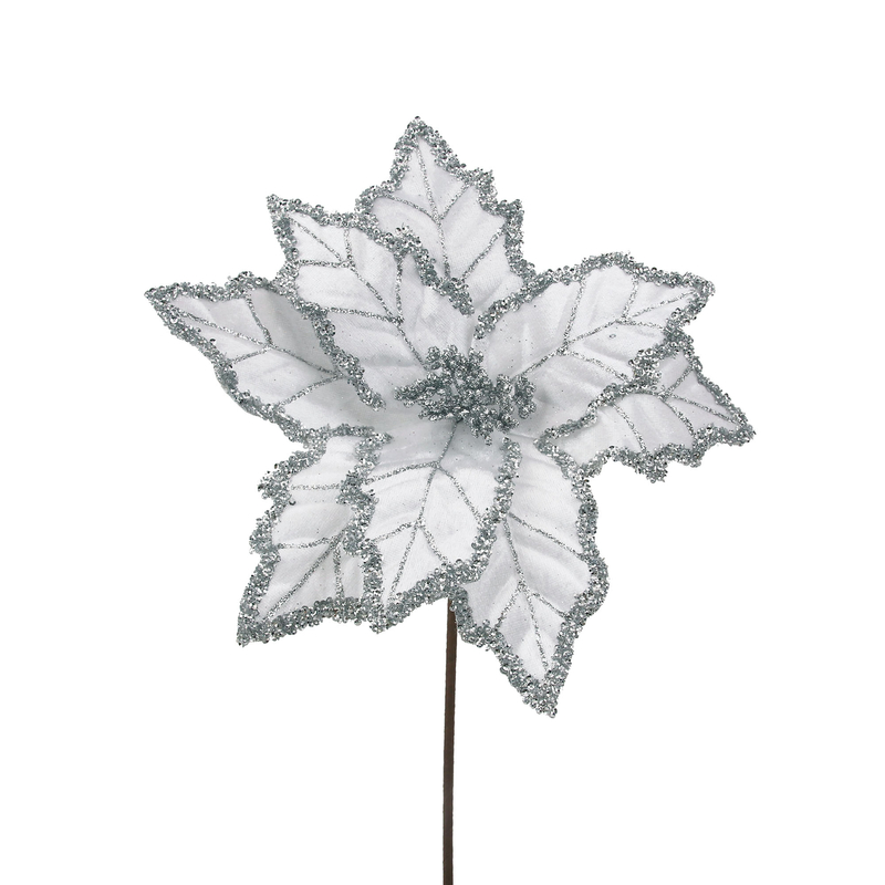 / 31Cm White Velour Poinsettia With Silver Glitter Detail 50Cm Stem