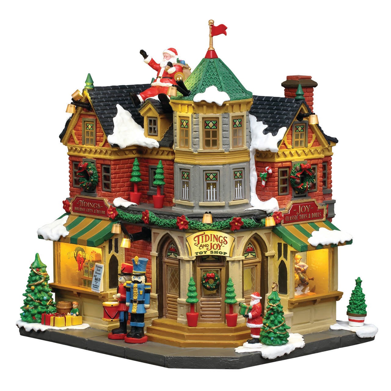 This toy shop is where Christmas dreams come true! A dashing duo of nutcracker guards welcomes guests of all ages as piles of presents await pickup. Peer into the lit windows to see toys and treasures on display, or look up to see Santa waving merrily from the roof. Every corner of this exciting place has been decorated with colorful cheer. Thanks to Tidings & Joy, Main Street is a magical place to shop.