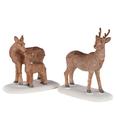 In a glistening winter wonderland, a deer family stands elegantly, while gentle snowflakes dance around them, creating a serene, enchanted scene of nature’s timeless beauty and quiet grace.