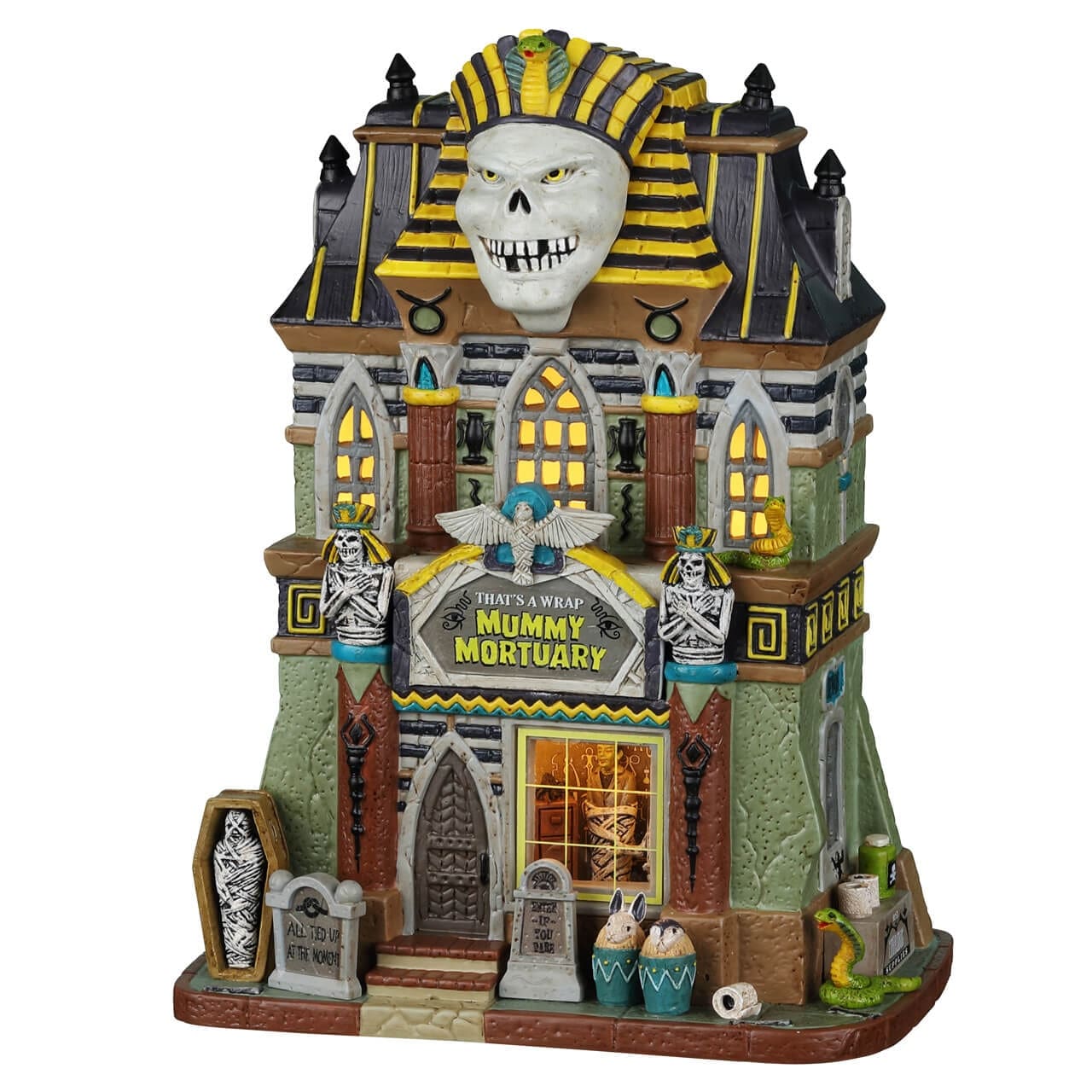 When it comes to this spooky town, there is no other way to commemorate a passing than a good old fashioned mummification! No fewer than four Egyptian mummies adorn the front of this mortuary, and a sneaky peak inside the window shows you what you are in for when your time comes! There are fun nods to Ancient Egyptian culture all over this building and it gets more detailed the more you look at it. The perfect addition to a model town full of ancient spirits.